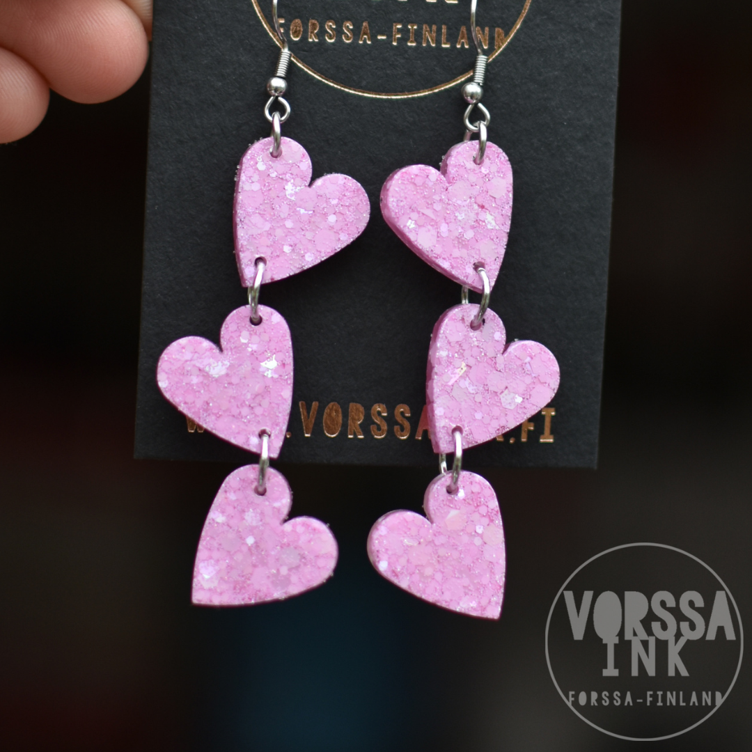 Kotimaiset Triple Love Glitteri -korvakorut ovat kauniit ja kevyet, käsityönä valmistetut korvikset niin arkeen kuin juhlaan.