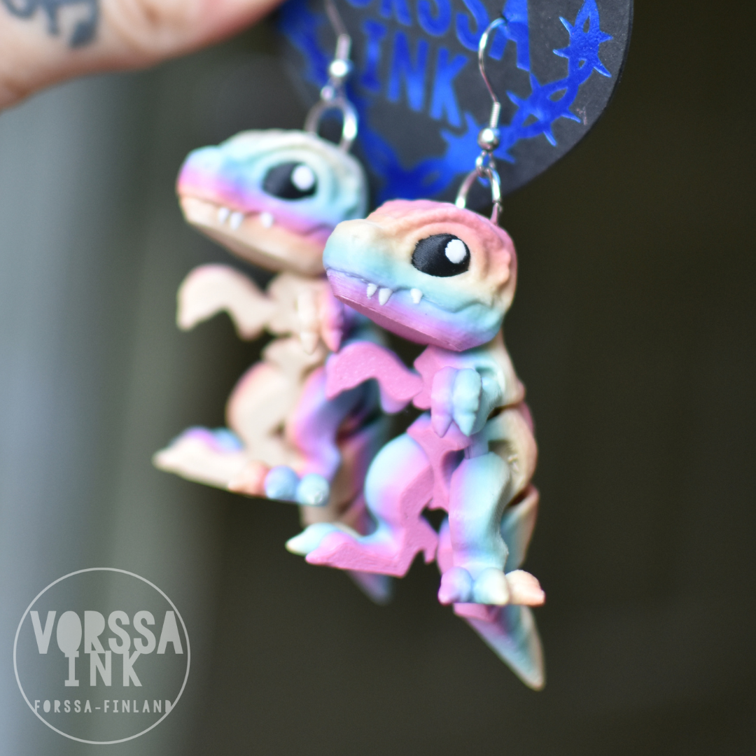 Dinosaurus-korvakorut on valmistettu 3d-tulostamalla. Materiaali on erittäin kevyttä, minkä ansiosta isotkaan korvakorut eivät ole raskaat, vaan lähes huomaamattomat käytössä. Lue lisää korvakorujen valmistuksesta ja materiaaleista.