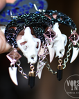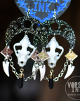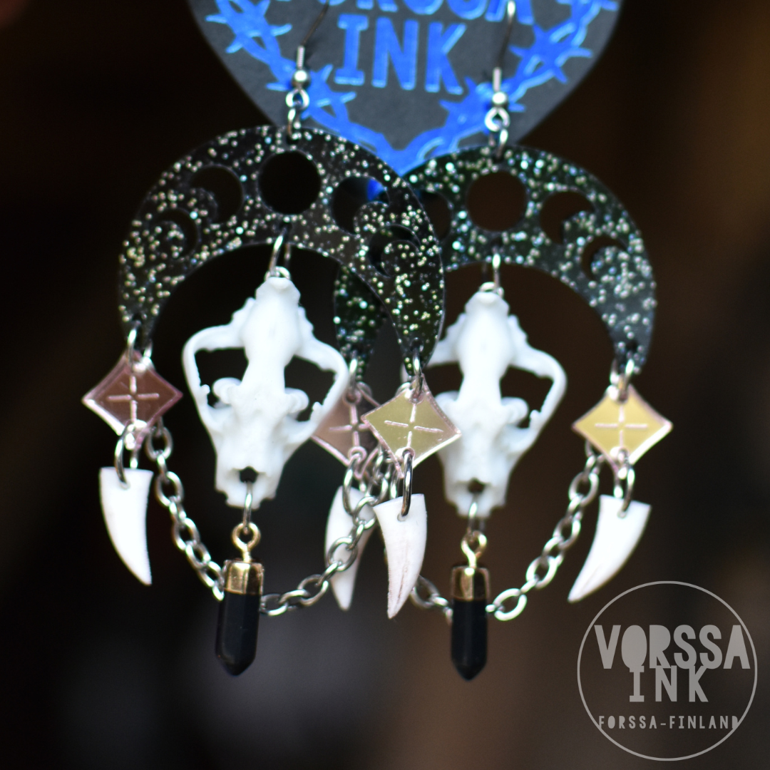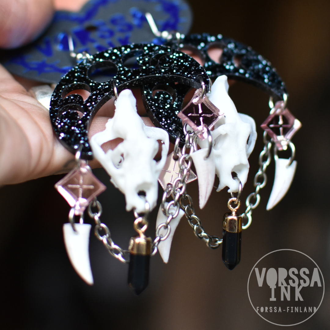 Kuu kallo-korvakorut on valmistettu käsityönä, kauniista ja kevyestä akryylilevystä laserleikkaamalla. Koruihin on valmistettu yksityiskohtaisia koristeita 3D tekniikalla. Materiaalit on erittäin kevyitä, minkä ansiosta isotkaan korvakorut eivät ole raskaat, vaan lähes huomaamattomat käytössä. Read more about earring making and materials.