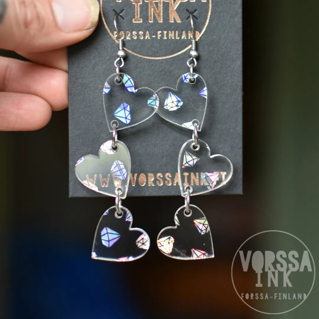 Triple Love -korvakorut on valmistettu käsityönä, kauniista ja kevyestä akryylilevystä laserleikkaamalla. Materiaali on erittäin kevyttä, minkä ansiosta isotkaan korvakorut eivät ole raskaat, vaan lähes huomaamattomat käytössä.
