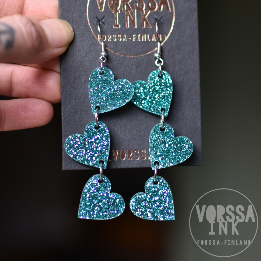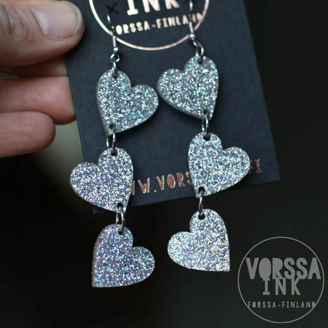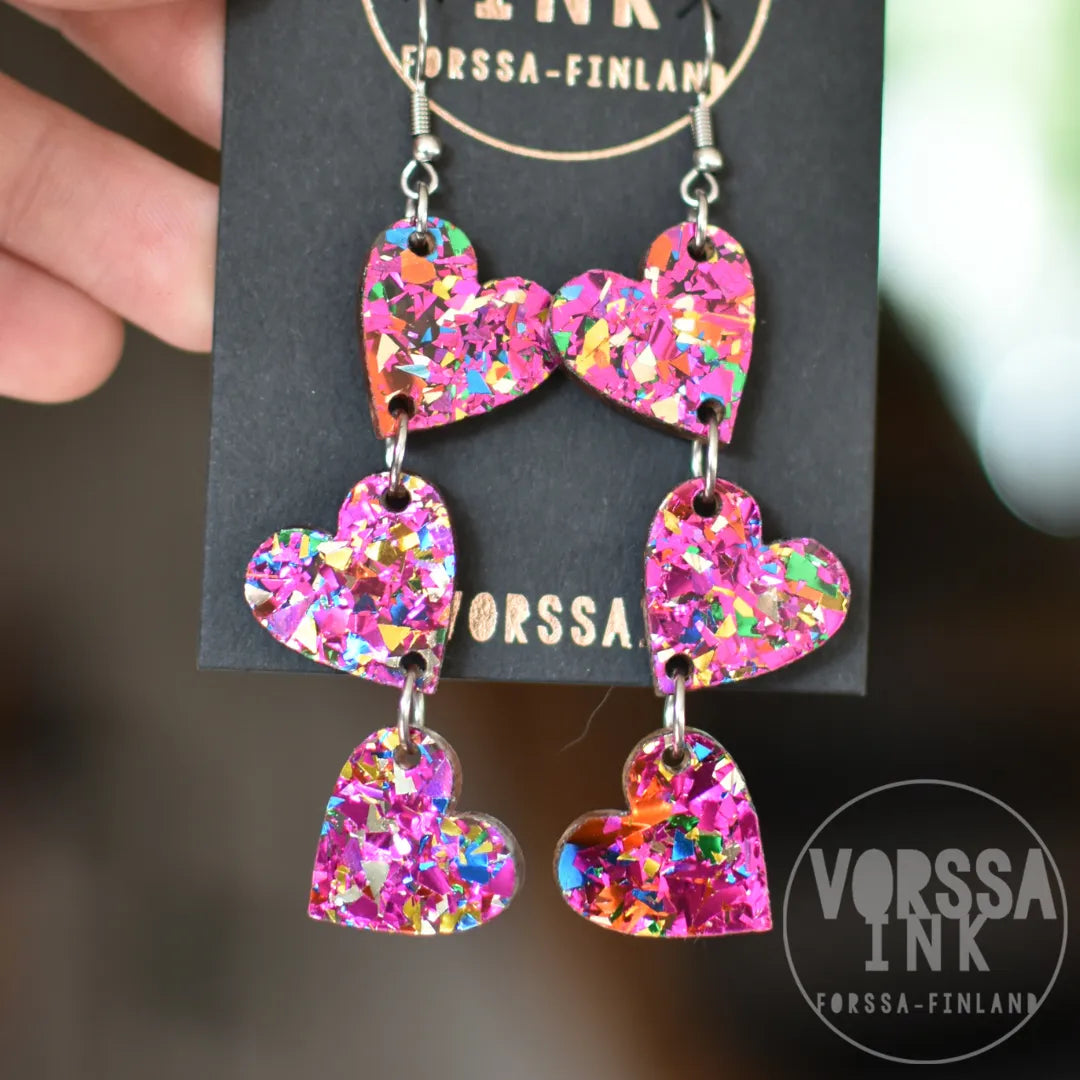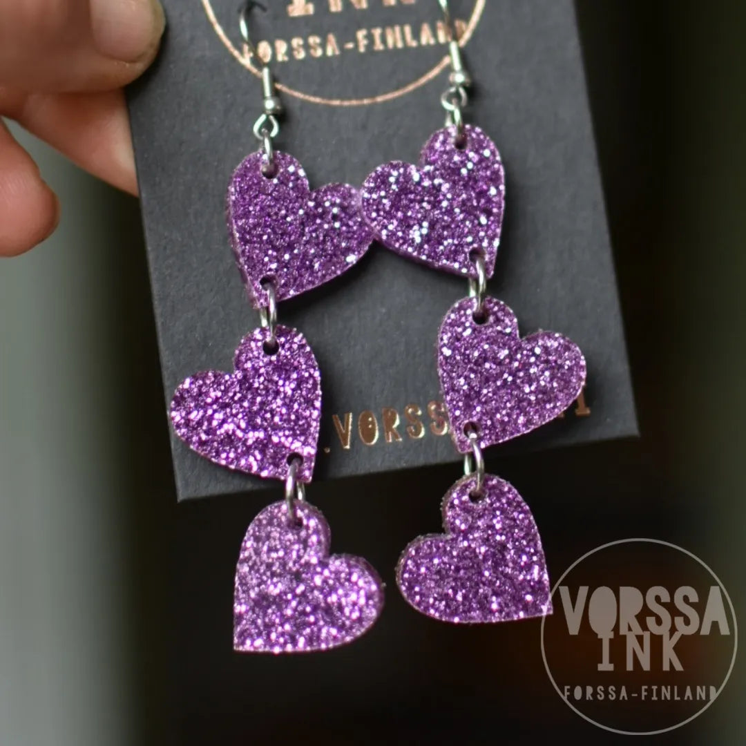 Kotimaiset Triple Love Glitteri -korvakorut ovat kauniit ja kevyet, käsityönä valmistetut korvikset niin arkeen kuin juhlaan.