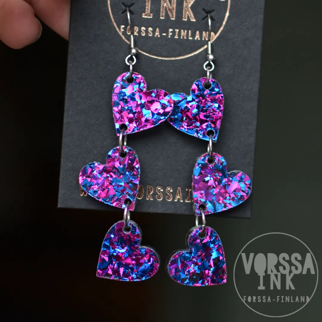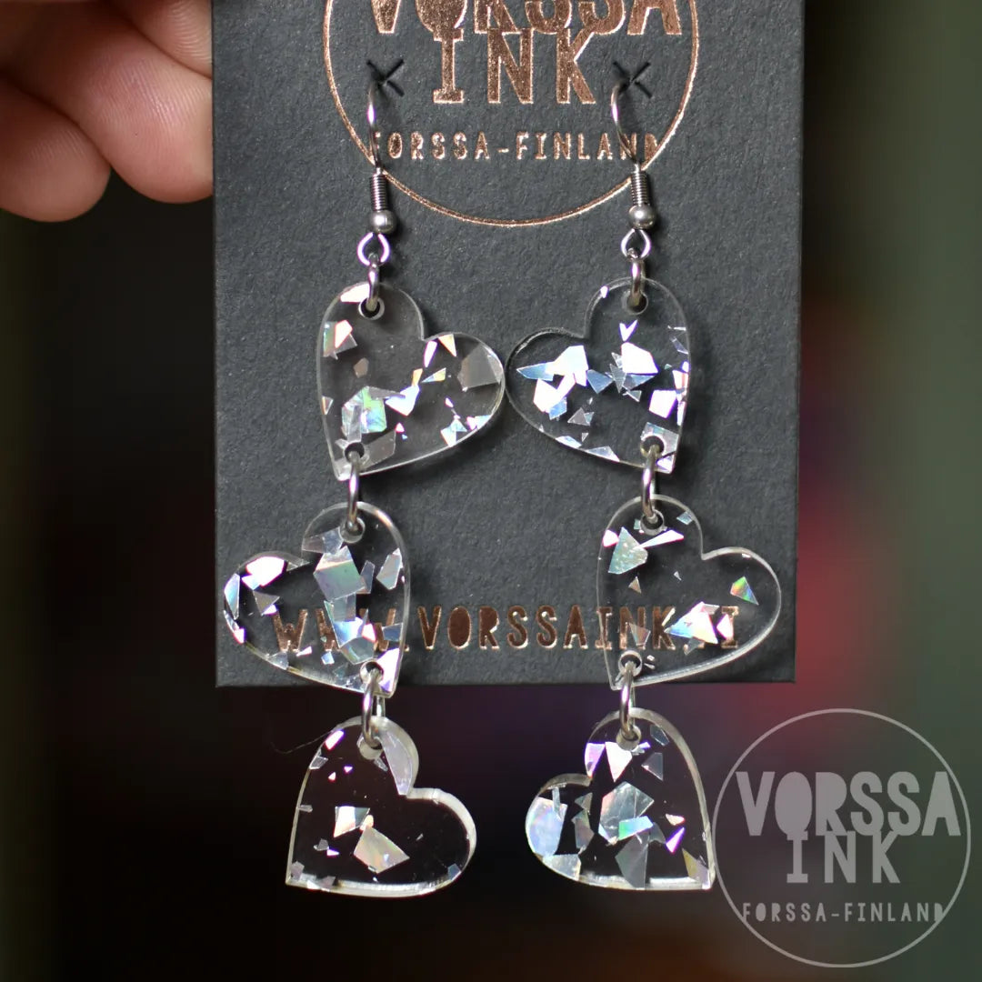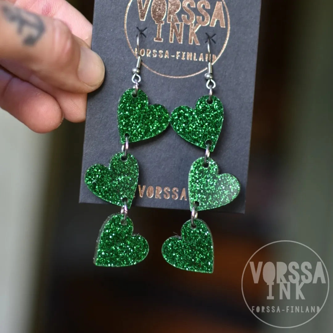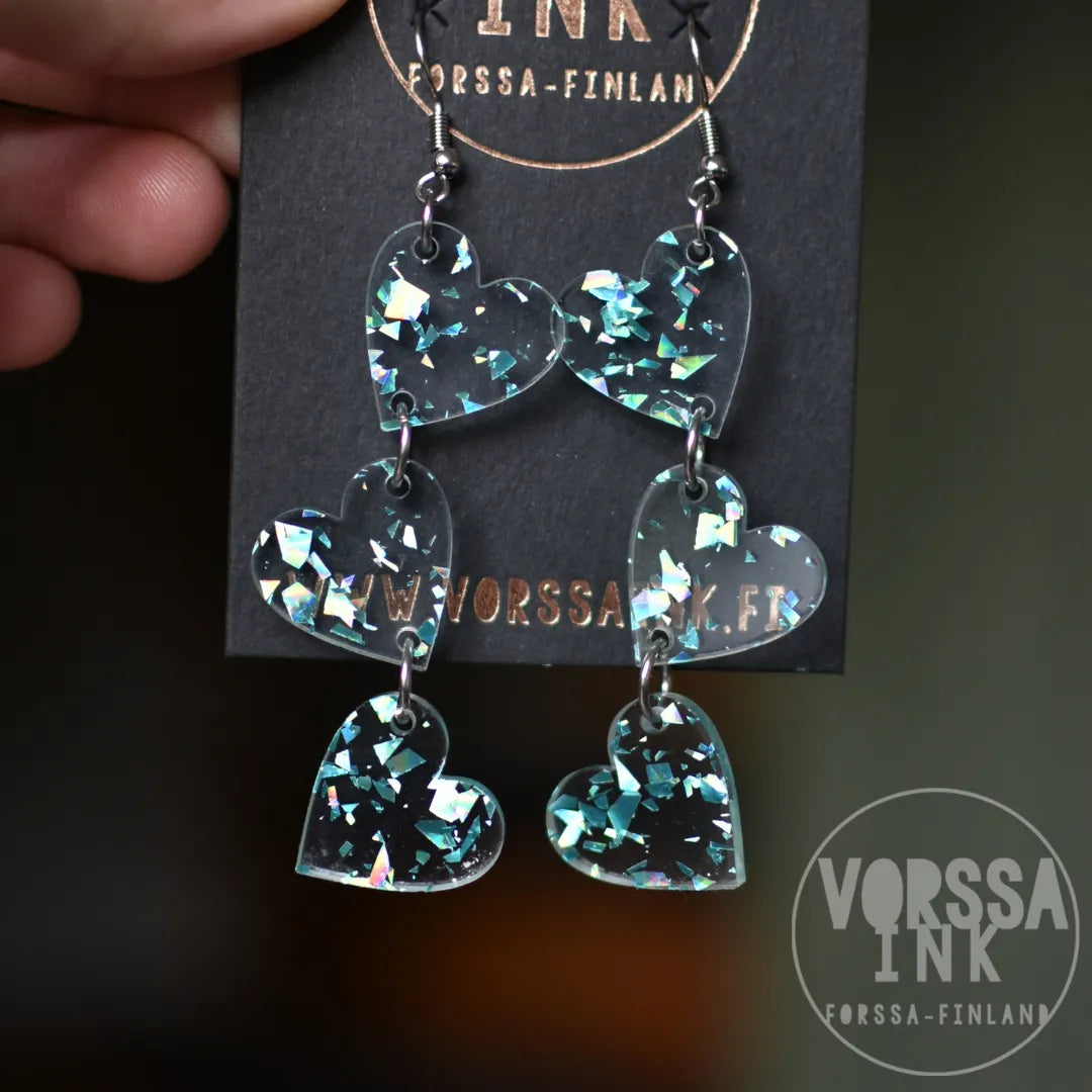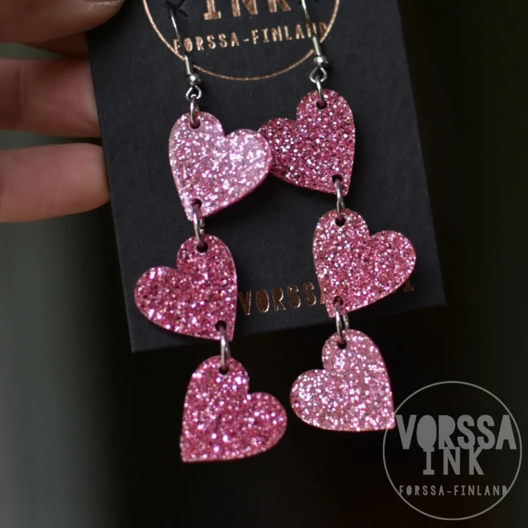Kotimaiset Triple Love Glitteri -korvakorut ovat kauniit ja kevyet, käsityönä valmistetut korvikset niin arkeen kuin juhlaan.