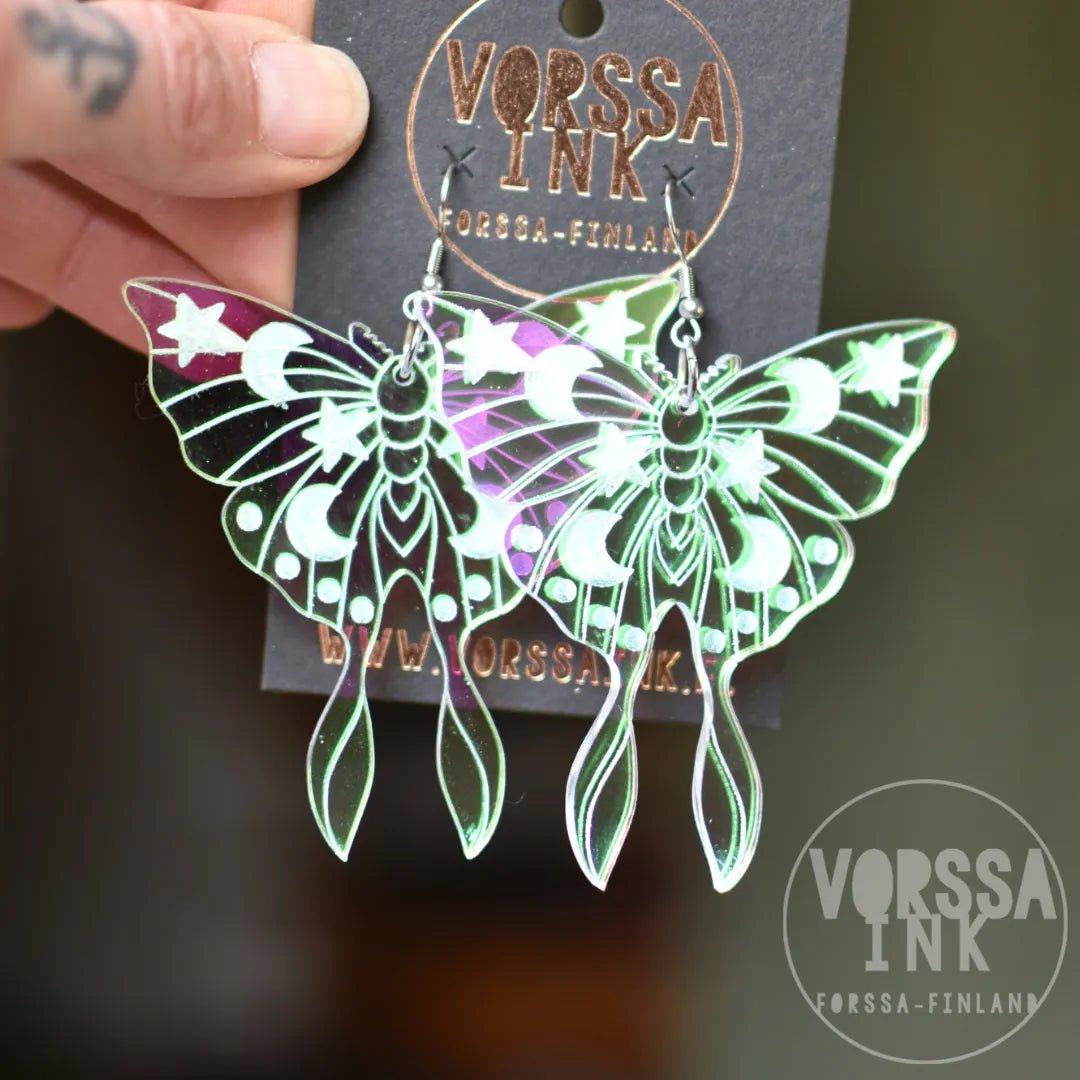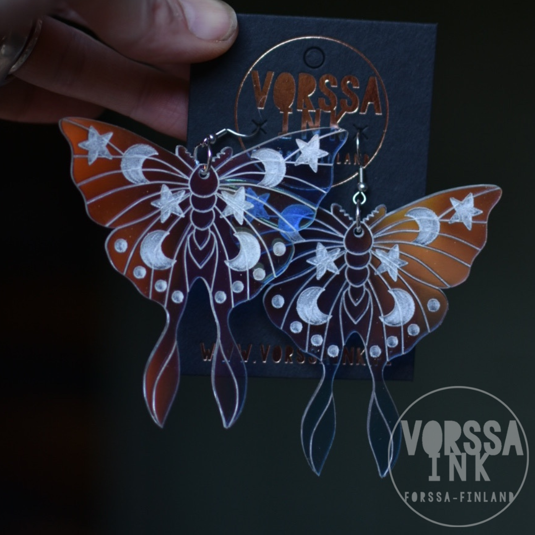 Nämä persoonalliset yökkösen muotoiset korvikset ovat erittäin näyttävät ja uniikit! Kauniista holo-akryylista valmistetut korvakorut on koristeltu näyttävin kaiverruksin. Isot korvakorut ovat erittäin näyttävät, mutta samalla kevyet ja mukavat käyttää.